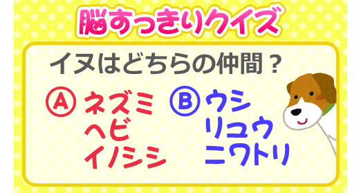 【問題】「A:ネズミ、ヘビ、イノシシ」「B:ウシ、リュウ、ニワトリ 」このとき、「イヌ」はどっちのナカマ?