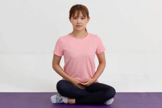 床に座り、片脚を立ててもう一方の脚と交差するように組みます。坐骨をしっかり床に預け、骨盤が後ろに倒れない位置をキープ。まずは背骨を上に引き上げ、“縦の軸”をつくる意識を持ちましょう。