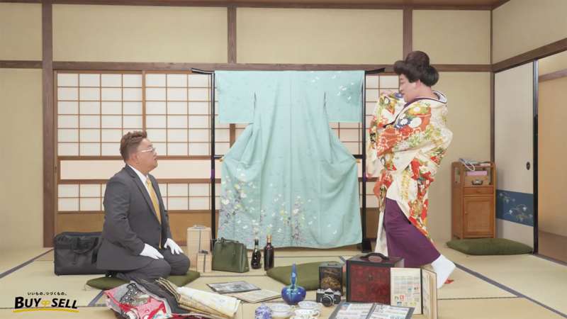そしてCMの本編では、バイセルの査定士に扮したサンドウィッチマンの伊達さんと、自宅のモノを売りたい富澤さんの掛け合いがコントのように展開。バイセル査定士役の伊達さんが、着物や古銭、骨董品などを売りたい富澤さんの自宅に訪問するという設定で、2種類のパターンで展開中。