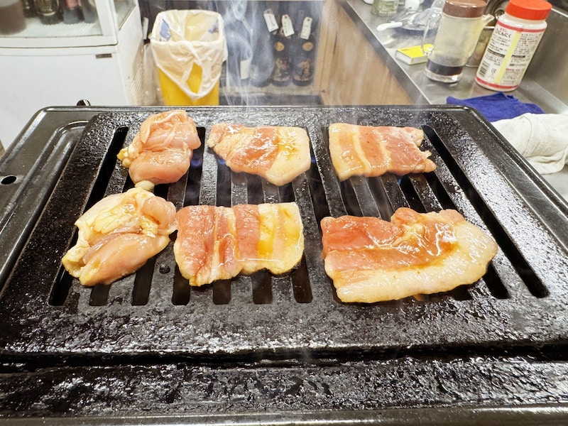 ディープに焼いたらたっぷりとタレにつけて食べる。
