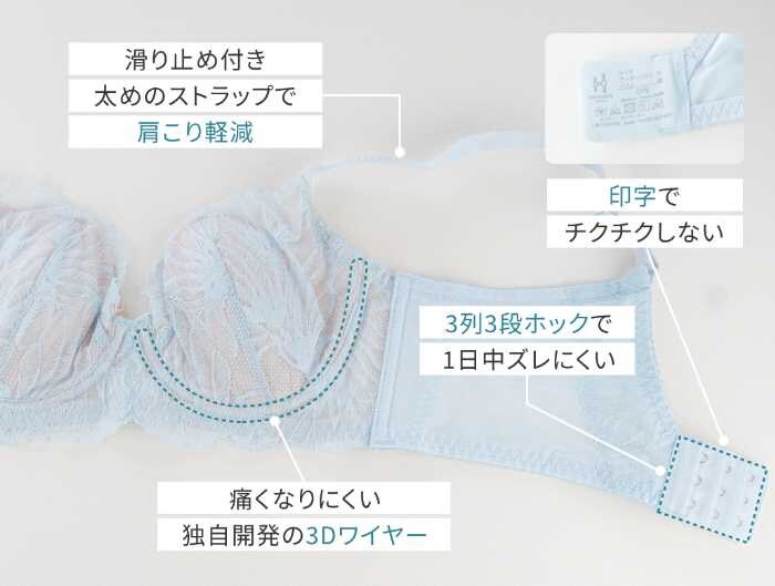 さらに独自の3Dワイヤーで痛みを軽減し、内側トップ部分のパッドで透けも防止。軽やかな着け心地と補整力を両立し、自然で美しいバストラインを叶えます。