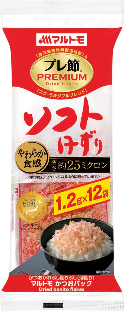 『プレ節』は通常のかつお節(マルトモの一般品)と比べて、ふわふわ食感と即溶けが特徴で、うま味成分(イノシン酸とアミノ酸)が豊富なことから、減塩レシピでも風味が補完され、自然な満足感を得られるそう。
