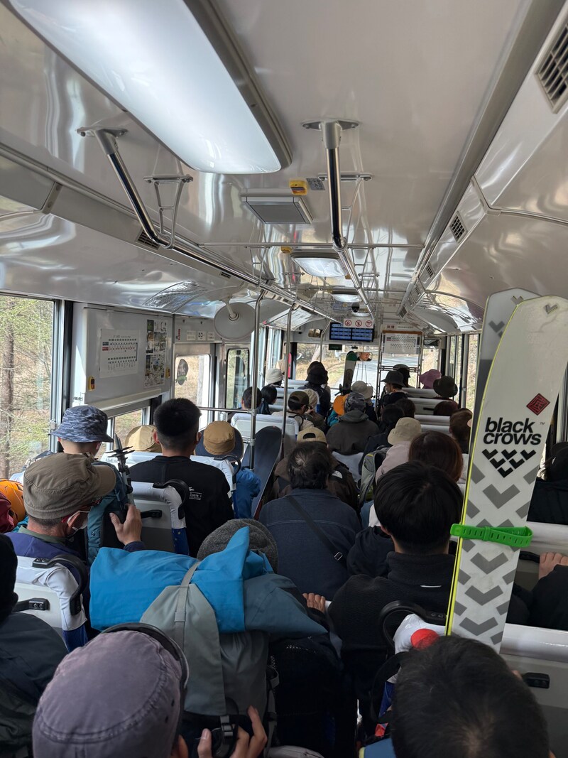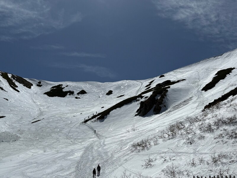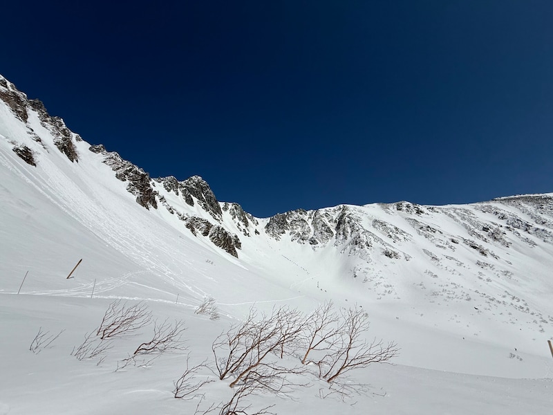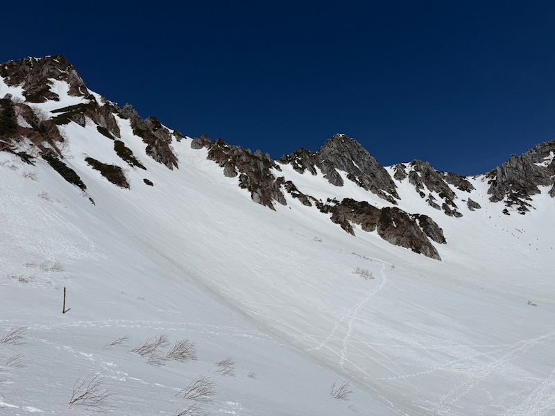 だが、今年はちょっと風景が違う。正面右手の前山や、左手の極楽平はあちこちに黒い岩肌やハイマツが見えているのだ。いつもより3週間も早い訪問なのに、春BC後半戦のような状況なのだ。