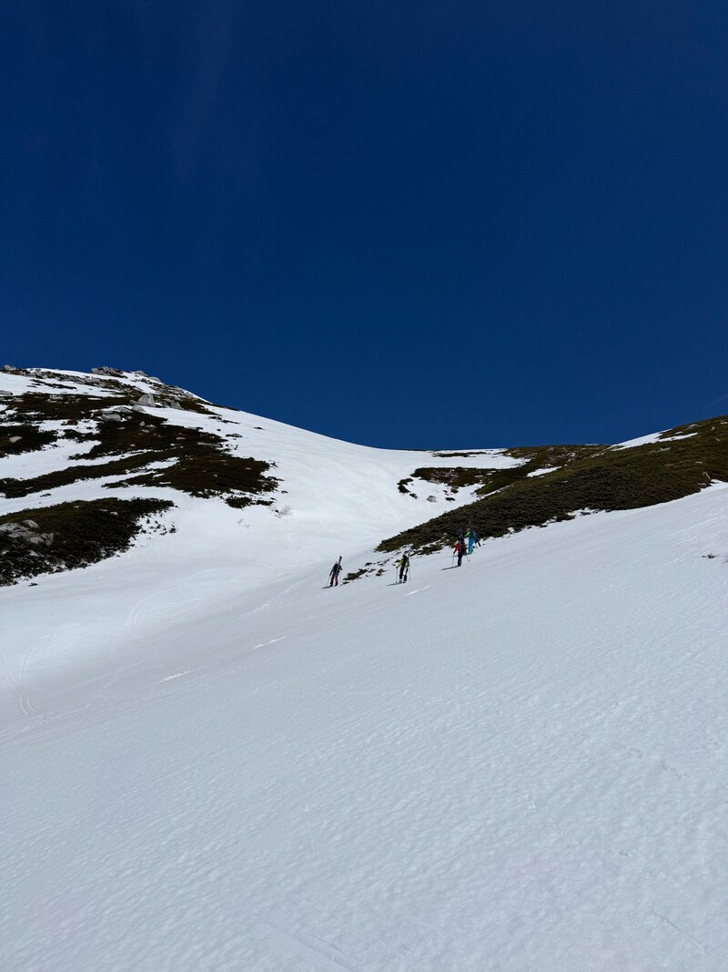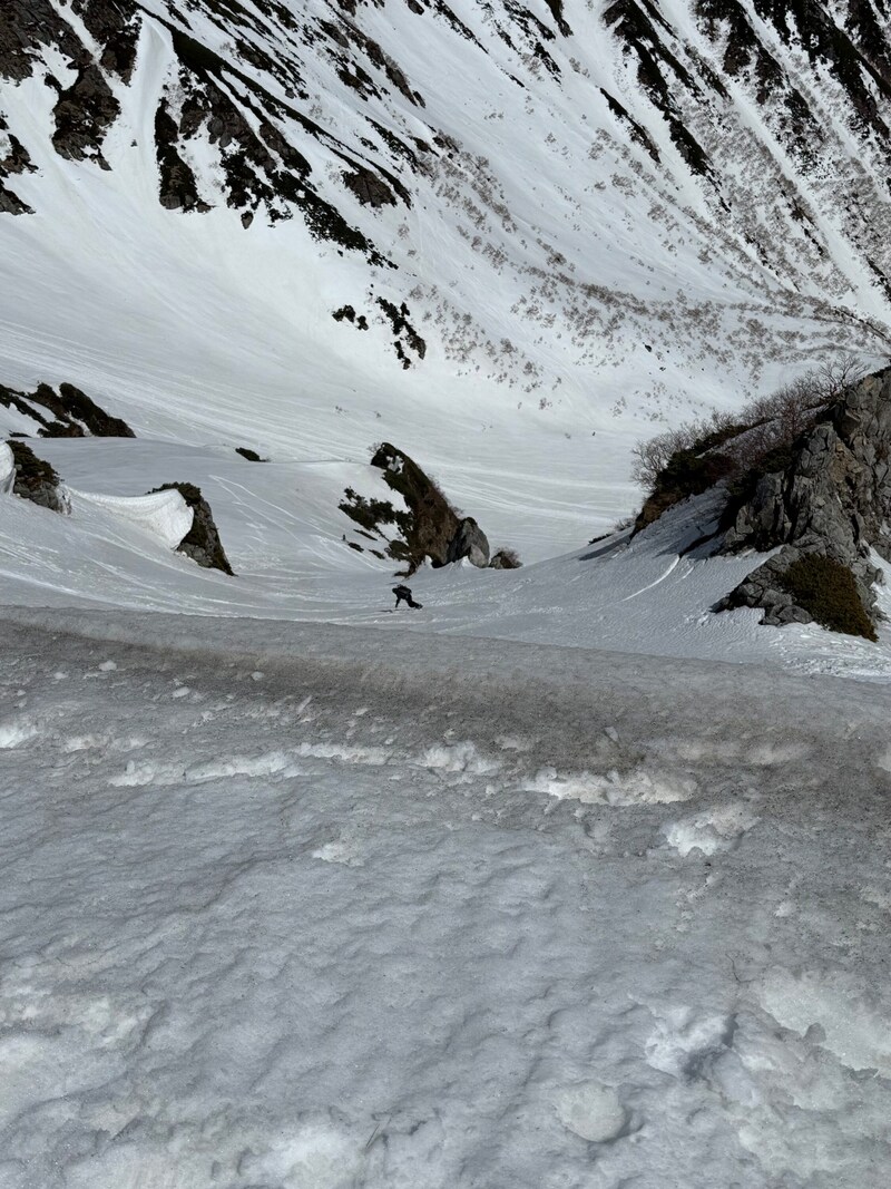 ここは距離は400mほどと長くはないが、斜度が35度前後はありそうな狭いコースを慎重にスピードコントロールして滑る。トップシーズンなら雪崩の巣という様相だが、春は比較的安全に滑れそう。ここを一気に滑り込めばカールの中心に戻る。