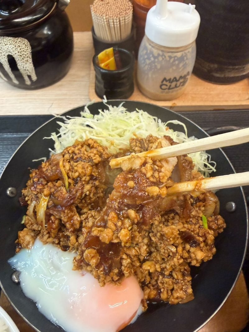 カツの上に肉のあんがドカッと、まさにカツが肉にうまるーんといった具合。この黒味噌をベースにした甘辛なあんが、サクッとしたカツになんともピッタリ。