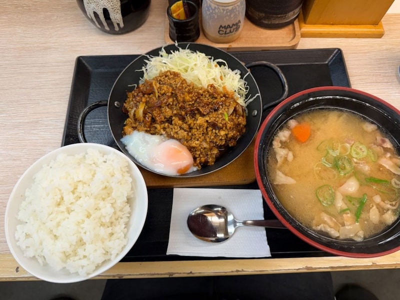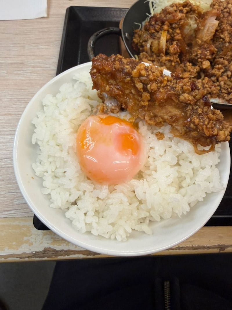 某日、「肉あんかけロースカツ定食」を食べてみた。温玉付きで100円プラス。定食はとん汁つき、プラス50円でとん汁のサイズを大にできる。無論、大に。