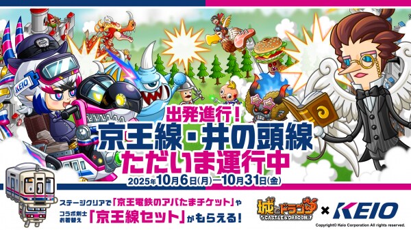 10月6日(月)10:00より、『京王電鉄』との初のコラボイベントを開催いたします。期間中は新しいコラボ激レアお着替えとしてメタドラガールの「京王ライナー」や剣士お着替え「京王電鉄セット」「京王線セット」が登場!また、「城ドラ世界地図」にコラボ限定名所が登場!実際に対象の駅を訪れることで来場者限定の“祝福”が発動し、発動中にリーグに参加すると「駅P」の争奪をかけた「駅主バトル」に挑戦することができます。祝福は全国のユーザーに「おすそわけ」することも!ぜひゲームとリアルで、期間限定のコラボイベントをお楽しみください。