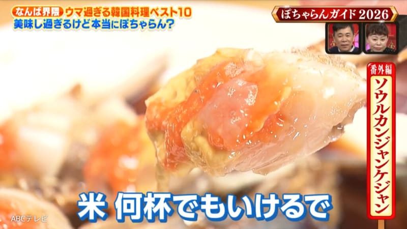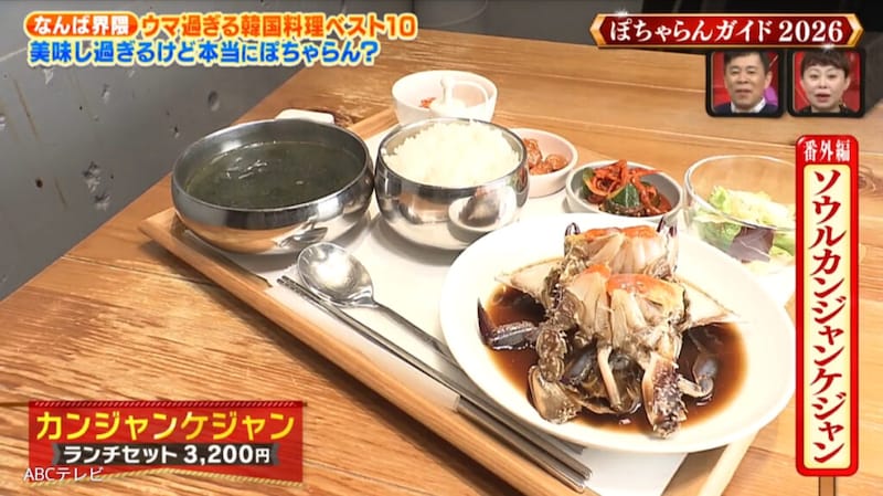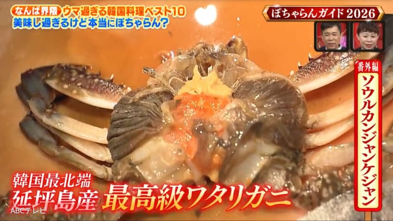 そのお店が「ソウルカンジャンケジャン 心斎橋店」。MCの岡村隆史(ナインティナイン)も好きだというカンジャンケジャンが看板メニューで、店主が韓国まで足を運んで厳選した最高級のワタリガニを使用するというこだわりようだった。