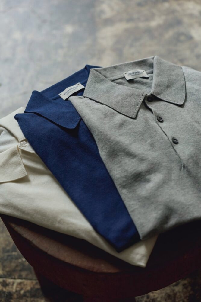 240年以上の歴史を持つ同ブランドは、イングランドのほぼ中央、ダービーシャー州のリーミルズ工場における一貫した生産背景を持ち、他とは一線を画すほどの美しくきめ細かな編目のニットウエアを製造。熟練の職人による手作業と高性能な機械を用い、世界中から愛される彼らの代名詞的存在が、30ゲージのシーアイランドコットンを使用した半袖ポロシャツ[アイシス]。