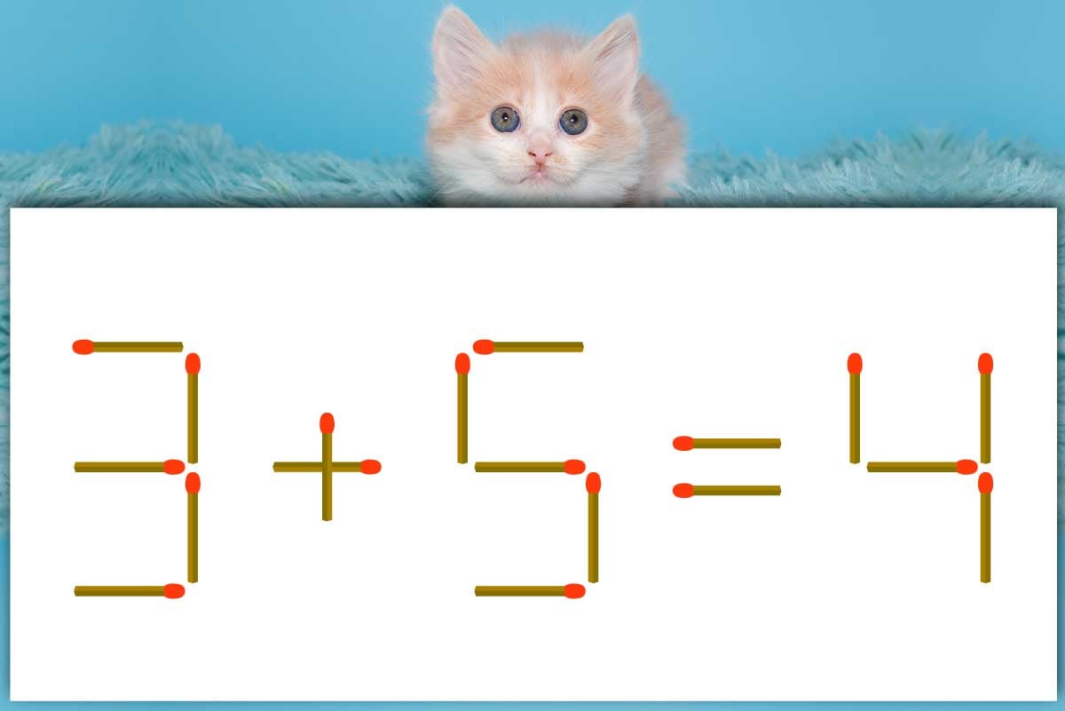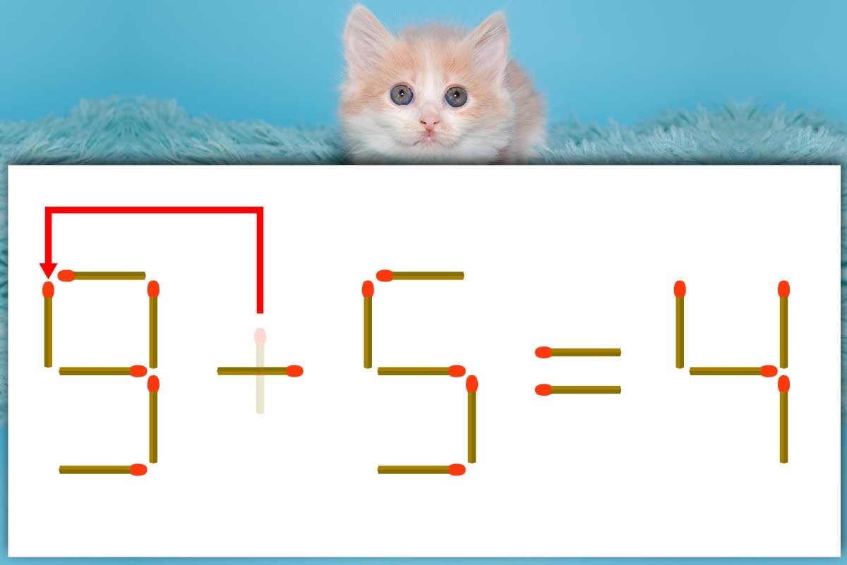 「+」のマッチ棒を1本、「3」に移動させて「9」を作り、「9-5=4」にする。※解答は複数ある場合があります。