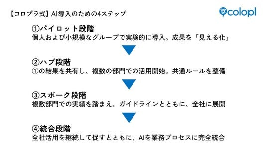 ここまでAI活用を社内に浸透させることができたのは、様々なステップや仕組みを段階的に整え、現場の業務フローに自然に組み込んできたからです。AI活用を「段階」で捉え、社員の心理に寄り添って広げていく。次にその具体的なモデルやステップをご紹介します。