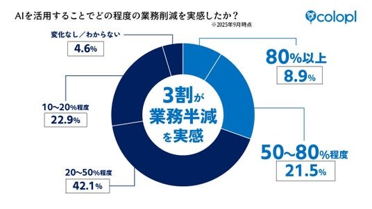 その活用度の高さの裏には、社員個人の業務効率化に対する実感の高さがあります。活用者の30%以上が「業務量50%以上の削減を実感」しており、まさに“AIを使うことで「作業時間が半分以下になった」と感じる社員が3人に1人以上いる”計算。AIを活用することで、日々の業務効率化に大きく貢献していることがこのデータから明らかになりました。