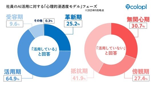 そこで当社は、社員の心理状態を読み解くべく、AIに対する6つの「心理的浸透度モデル」を構築し、各社員のAIに対するスタンスを整理しました。