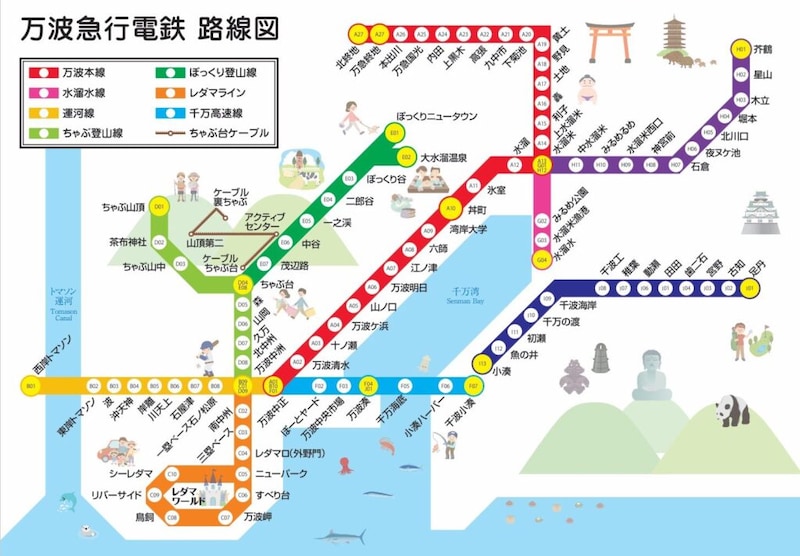 一見、どこかの路線図のように見えるこのイラスト。実は全部架空の駅で作られた架空の路線図!名付けて『万波(まんなみ)急行電鉄』(略称:万急)。