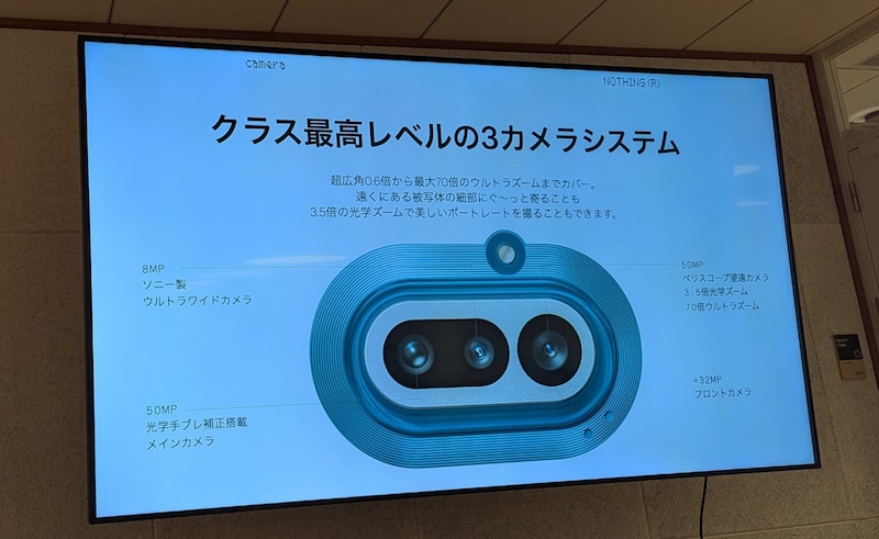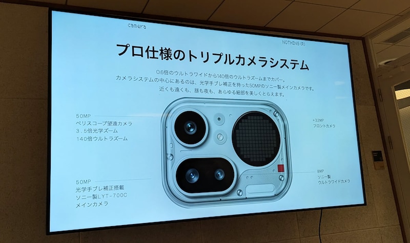 カメラは光学手ブレ補正搭載のソニー製5000万画素広角、800万画素のソニー製超広角、3.5倍光学で最大140倍のウルトラズームに対応する5000万画素ペリスコープ望遠の3眼構成。マクロ撮影に対応し、被写体に近づくと自動でマクロモードに切り替わります。インカメラは3200万画素。AI消しゴム、4Kビデオ録画、カメラプリセットといったカメラ機能もNothing Phone (4a)と同等です。