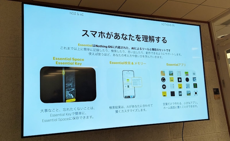 本体サイズはH163.6×W76.6×D7.9mm、重量は約210g。IP65の防水・防塵に対応。ディスプレイは6.83インチのフレキシブルAMOLEDで、解像度は2800×1280ピクセル。最大輝度は5000nits、リフレッシュレートは最大144Hz。バッテリー容量は5080mAhで、30分以内に1日分の充電ができる50W急速充電に対応します。プロセッサーはQualcomm Snapdragon 7S Gen 4、OSはNothing OS 4.1。eSIMとFeliCaに対応します。左側面にEssential Keyを搭載し、AI機能はNothing Phone (4a)と同等。
