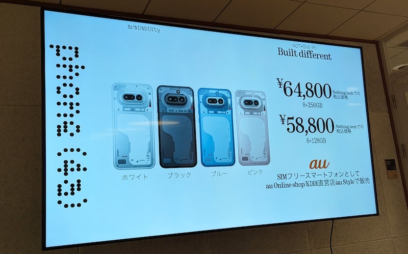 5月8日の発売予定で、価格は8GB RAMと128GBストレージのモデルが5万8800円(税込)、8GB RAMと256GBストレージのモデルが6万4800円(税込)。nothing.techに加えてau Online shop、KDDI直営店、au StyleでSIMフリースマートフォンとしての販売も予定しています。