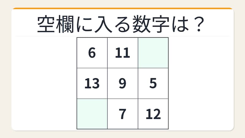 魔方陣の基本をしっかり押さえていれば解ける一問でした。次はさらに難しいパズルにも挑戦してみてください!