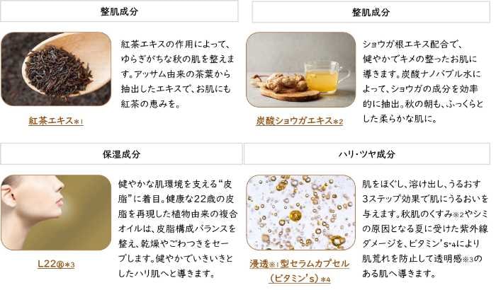 *1 チャ葉エキス *2 ショウガ根エキス *3 トリ脂肪酸(C18-36)グリセリル、トリ脂肪酸(C12-18)グリセリル、ホホバエステル、スクワレン、マカデミアナッツ脂肪酸フィトステリル、フィトステロールズ、トコフェロール *4 オオアザミ果実エキス、トコフェロール、カルノシン、レシチン