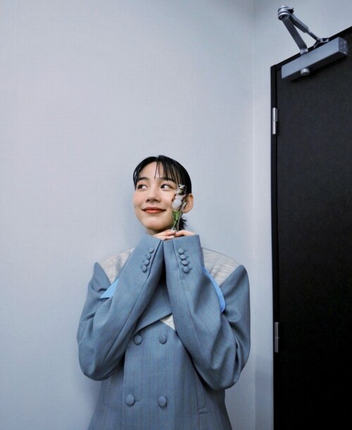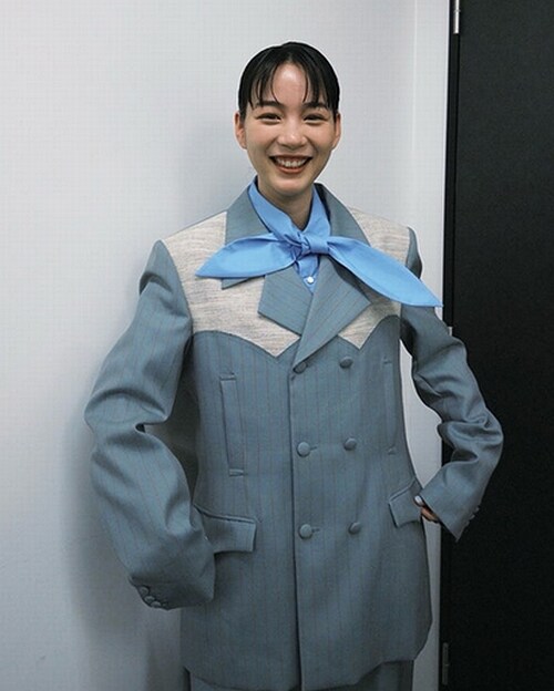 本人いわく「ブルーに見えるけど、緑色のセットアップ」だと説明し、落ち着いたトーンの衣装が知的な雰囲気を引き立たせ「テアトルのアフター・ザ・スパイスが飲みたかったよう」とおちゃめな一言を添えた。