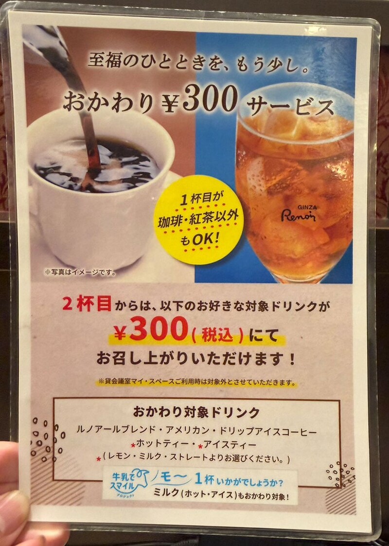 2杯目から、対象のコーヒーや紅茶、ミルクを300円で飲むことが出来るというもの。1杯目がコーヒーや紅茶以外でもOK。