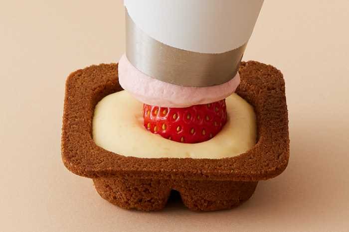 北海道産いちごを丸ごと1粒、生チーズムースで包み込んだ贅沢なチーズケーキです。販売期間は2026年4月24日(金)〜6月下旬予定。