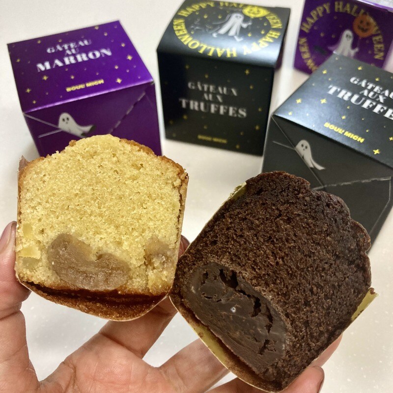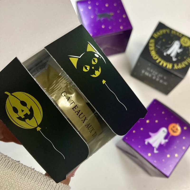 「トリュフケーキ」は、トリュフ・オ・ショコラをまるごと一粒、濃厚なショコラ生地に閉じ込め大切に焼き上げています。「ガトー・オ・マロン」は、マロンペースト・細かく刻んだ栗の甘露煮・マロングラッセ…3種のマロンを閉じ込めた奥深い味わいです。ちょっと待って、パッケージの底にもお化けが描かれていますよ!