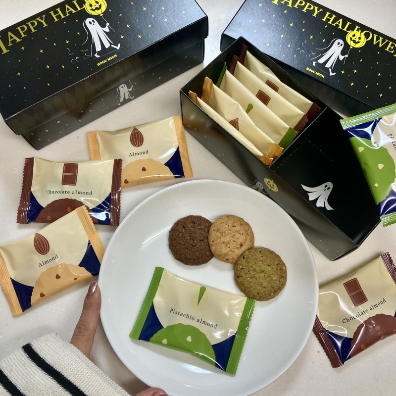 アーモンド、チョコアーモンド、ピスタチオアーモンド…バラエティ豊かなクッキーは沖縄県産のさとうきびの原料糖のみで作られた「本和香糖(ほんわかとう)」を使用。口当たりが良く、まろやかで優しい甘さのサクッとした食感のクッキーです。食べきるとパッケージの底からお化けがお見えしましたよ!