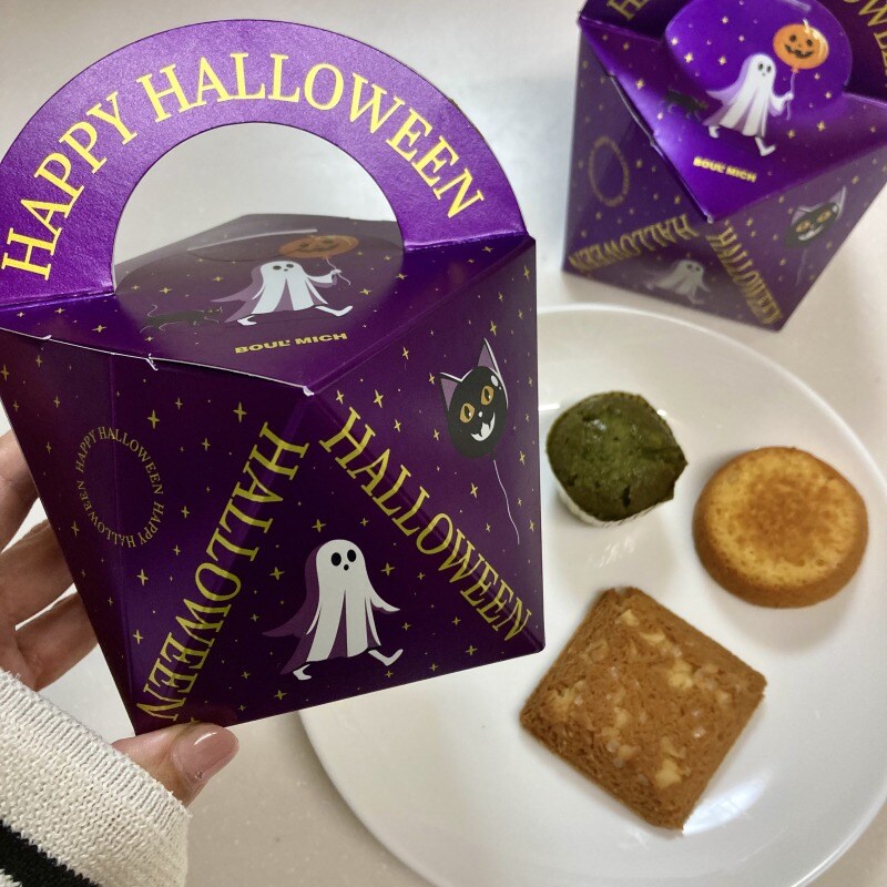 宇治抹茶のミニトリュフケーキ、しっとりとしたりんごバターケーキ、サクサクのヌーヴェルガレット(バニラ)が各1個こづつ、パープルのハロウィン限定BOX詰め込まれています。こちらはちょっとしたお手土産におすすめ。季節感があり会話も盛り上がるはず!