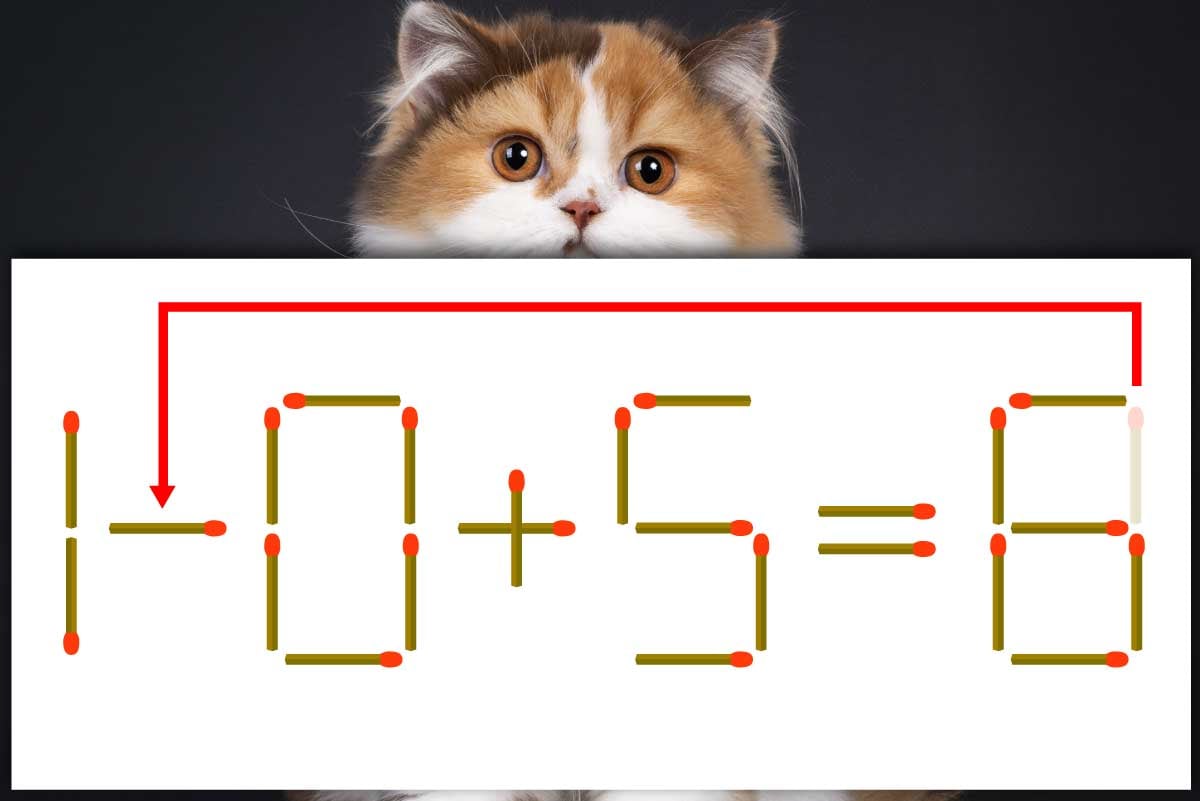 「8」のマッチ棒を1本、「1」と「0」の間に移動させて「-」を作り、「1-0+5=6」にする。※解答は複数ある場合があります。