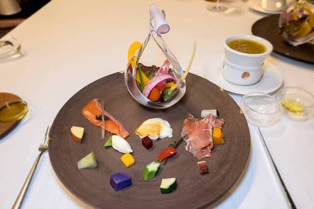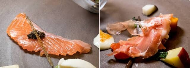 栃木県で品種改良された「ヤシオマス」には、黒オリーブのペーストや魚の皮目のチップが盛り付けられ、脂のりのいい上品な味。生ハムは目の前でスライスされ、フワっと柔らかで塩味も控え目。野菜と共に味わいました。