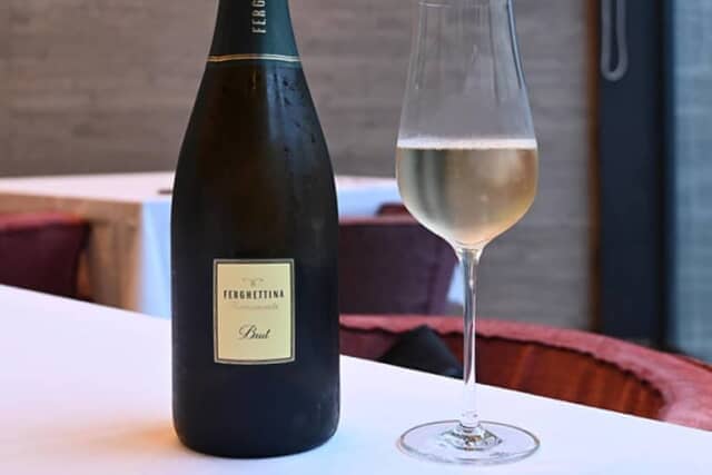 ワインはペアリングでオーダー。乾杯酒はイタリア最高峰のスパークリングワインと称されるロンバルディア地方の「フランチャコルタ ブリュット」。キメの細かな泡が口いっぱいに広がる心地よさと、シャルドネ90%とピノ・ネロ10%のグレープフルーツを思わせるフルーティな味わい。楽しいディナーの始まりを告げる一杯です。