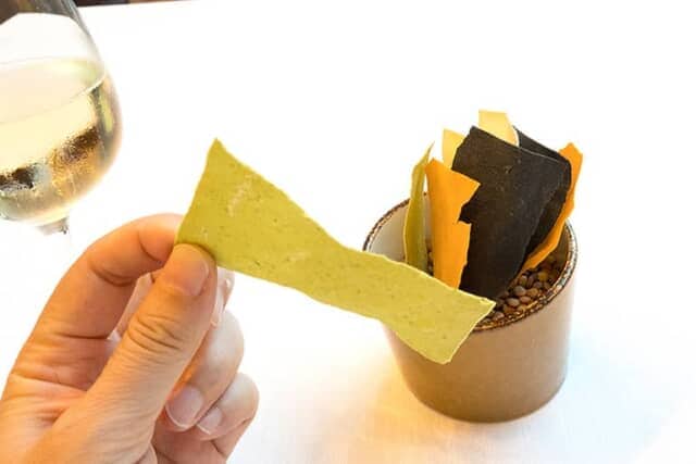 カリカリサクサクに焼いた食べ物の総称「クロッカンテ」は、ちょっと不思議で面白いおつまみ。つい「これは何ですか?」と尋ねてしまうので、スタッフと会話がはずむきっかけにもなりました。色と味付けはバジルやトマト、イカスミなどイタリアと由縁のある食材が使われ、それぞれの風味がほんのりと伝わります。