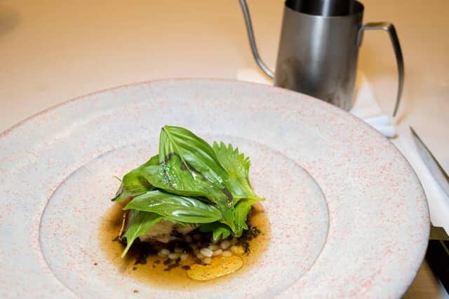 テーブルに運ばれた岩魚(イワナ)の蒸し焼きに、目の前で温かい胡麻油をかける意外性に驚きました。もち麦と黒米で作るリゾットの上に、岩魚と生ハム、貝のペーストを重ねて網脂で包み、紫蘇の醤油漬けを使ったソースでいただきます。岩魚の火入れも絶妙で身はとっても柔らか。コクがあって癖のない「太白胡麻油」がかかり、料理全体の味の調和もみごとです。