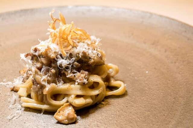 トスカーナ地方では猪の肉もよく使われるのだとか。麺は太めの平打ちタリアテッレ。猪肉を使ったサルシッチャ(ソーセージ)と赤玉ねぎを合わせたトスカーナ地方伝統の “フラタッキオーネ” 風ソースに、ポルチーニ茸を絡めます。混ぜると具もゴロゴロ入っていて、パルミジャーノ・レッジャーノの豊かな風味と猪肉独特の旨みなど、奥深い味わいを楽しめます。