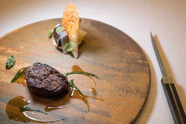 炭火でじっくり焼き上げられた牛肉に、紫にんじんや姫だいこんなどローストした根菜類が添えられます。イタリアのデミグラスソースとも言えるスーゴ・ディ・カルネと緑色のネギニラの2種類のソースは、肉に寄り添うサッパリとした味。ワサビのコンフィも添えられて、多彩な味で楽しめます。