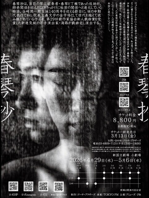 原作「春琴抄」は、1886年生まれの谷崎潤一郎による、盲目の奏者 春琴と丁稚であった佐助の、師弟関係をきっかけに進化していく関係を描いた中期代表作であり、耽美主義文学の金字塔として読み継がれている作品。第29回劇作家協会新人戯曲賞を受賞した新進気鋭の若手演出家 海路が本作を戯曲化・演出します。