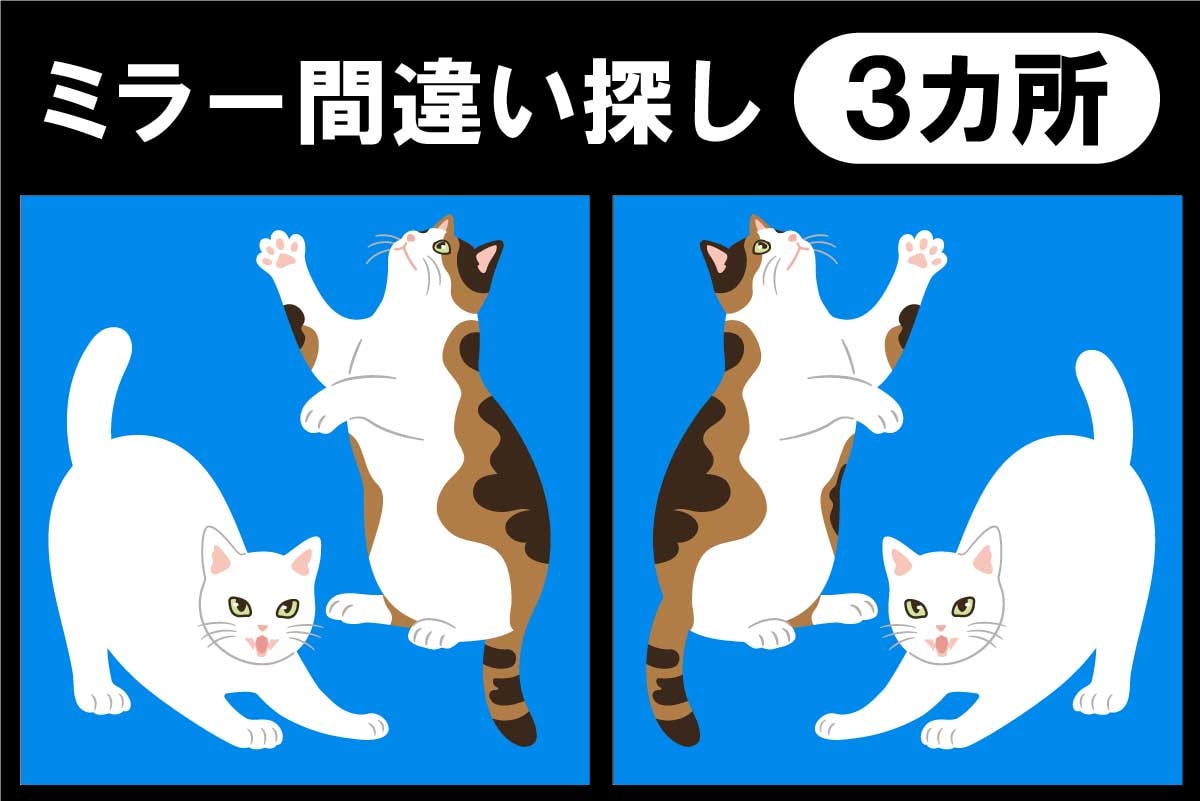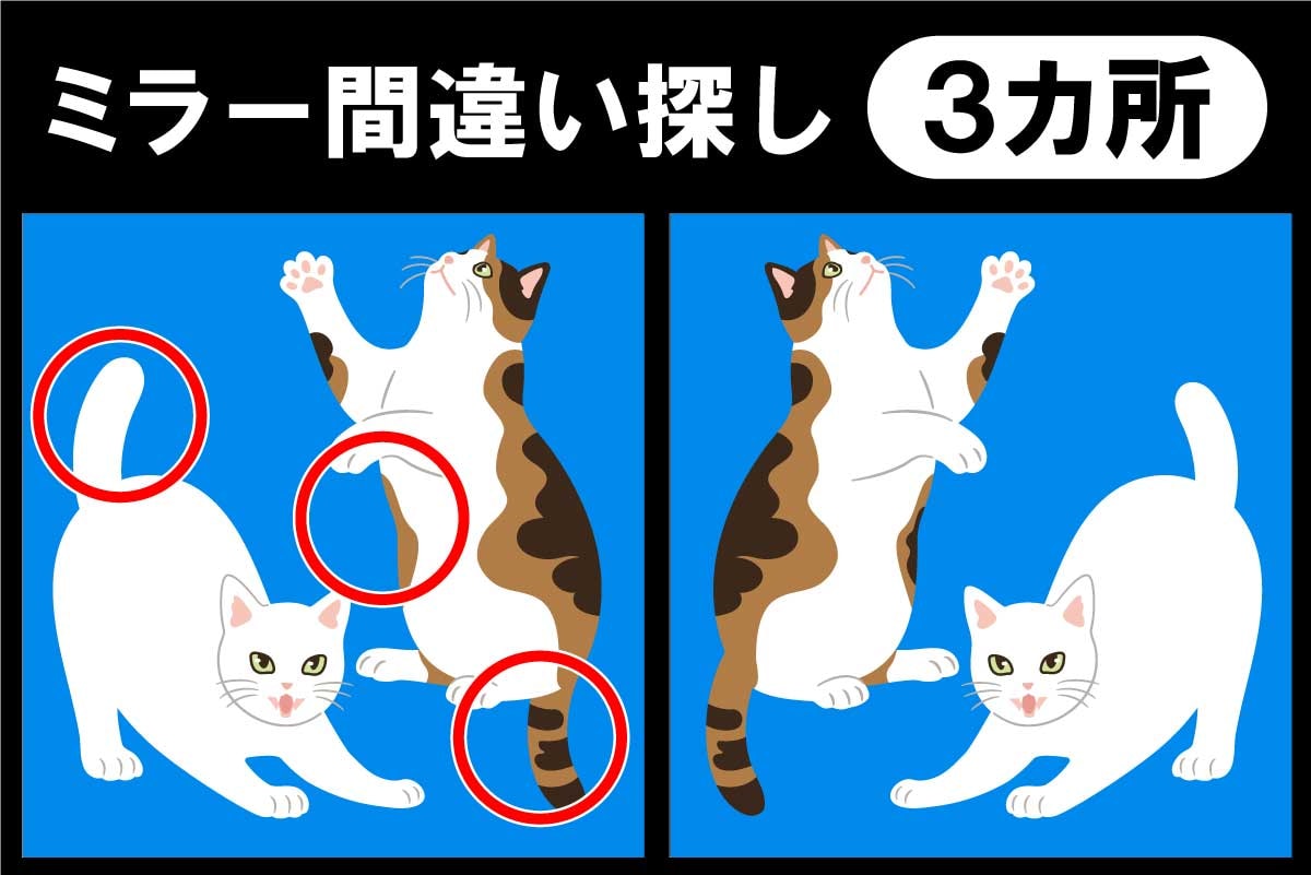 3カ所の違いは、1.白猫の尻尾の大きさ、2.三毛猫の尻尾の向き、3.三毛猫のお腹の模様