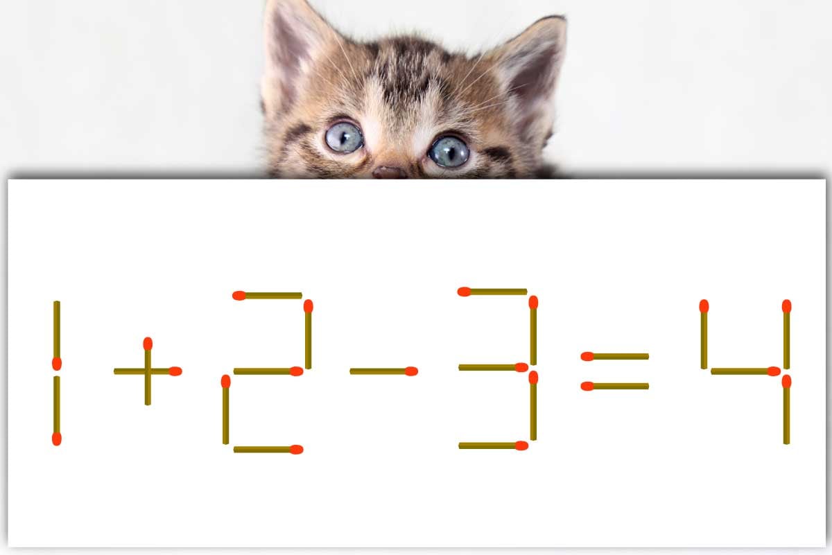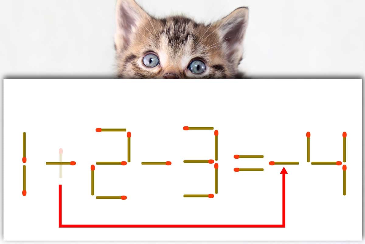 「+」の縦向きのマッチ棒を取り、横向きに回転させて「4」の左側につけ、「1-2-3=-4」にする。※解答は複数ある場合があります。