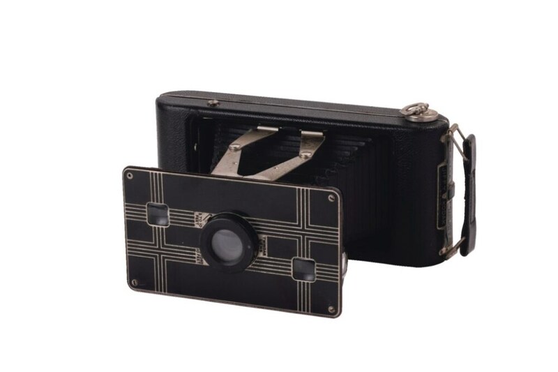 1933年から48年にかけて製造された、アールデコ調のデザインが特徴的なフォールディングカメラSix-16。1933〜37年の前期モデルのため、フロントパネルが個性的。