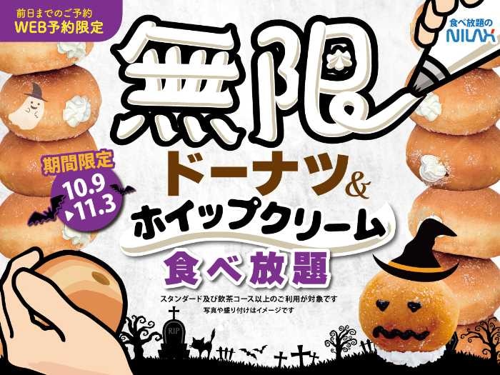 全国のニラックスブッフェ各店で実施される「無限ドーナツ&ホイップクリーム」コースは、通常コース料金のまま楽しめるWEB予約限定プラン。