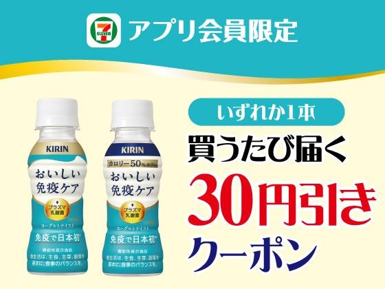 4月20日から5月3日までの期間、セブン-イレブンアプリを提示してキリン「おいしい免疫ケア」「おいしい免疫ケア カロリーオフ」(各100ml)を購入すると、次回使える30円引きクーポンがもらえます。