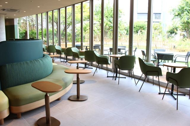 店内は西日本最大規模を誇る広さで、ベビーカーや車いすでも通りやすいゆったりとした設計。ベビーカーをそばに置いたまま座れる席も多く、シームレスに配置された座席が開放感を演出しています。