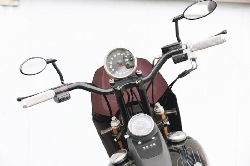 クラブスタイルらしく高めのライザーにハンドルをセットし、ピンゲル製ハイスロットルキット、PM製ハンドコントロールキットを採用。