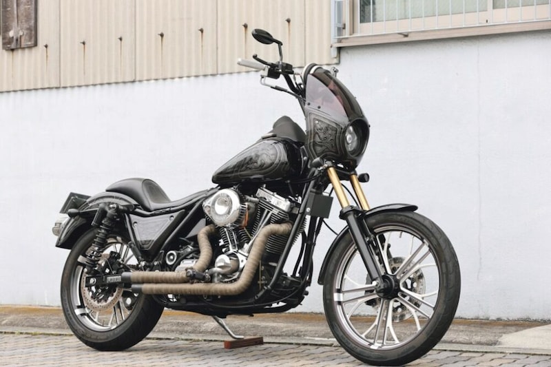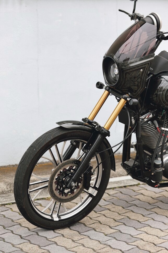 人気のクラブスタイルをフォース流にハイエンド&ハイパワーにカスタマイズ。1991年式FXRをベースに、S&S製V124エンジンを搭載し、ベイカー製6速オーバードライブ、バンディット製3インチオープンプライマリーとロックアップクラッチを採用した。豪快でワイルドな乗り味で、トルクフルという言葉では表現できない強烈な加速を体感できる。カミカゼピンストライプ渾身の不良テイストあふれるダークなペイントが華を添えている。