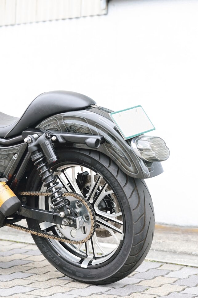 プログレッシブ製リアサスペンションを搭載。PM製ホイール、ブレーキキャリパーにサンダンス製ブレーキローターを装備し、足まわりを強化。