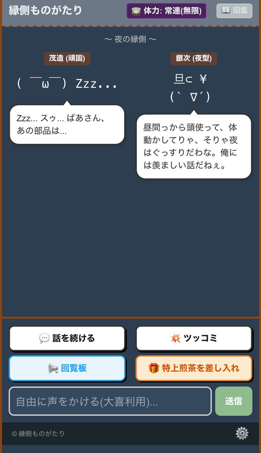 お爺ちゃんを驚かせて喜ばせる「特上煎茶(100円)」の差し入れや、月額500円で会話回数が完全無制限になる「縁側の常連さん」制度も用意。あなたのスタイルに合わせて、お爺ちゃんたちとの絆を深めることができます。