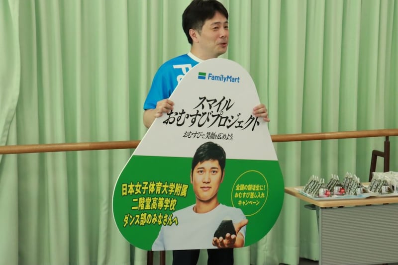 その後、ファミリーマートのおむすびと大谷選手のパネルが運ばれてくると、生徒たちも大興奮。