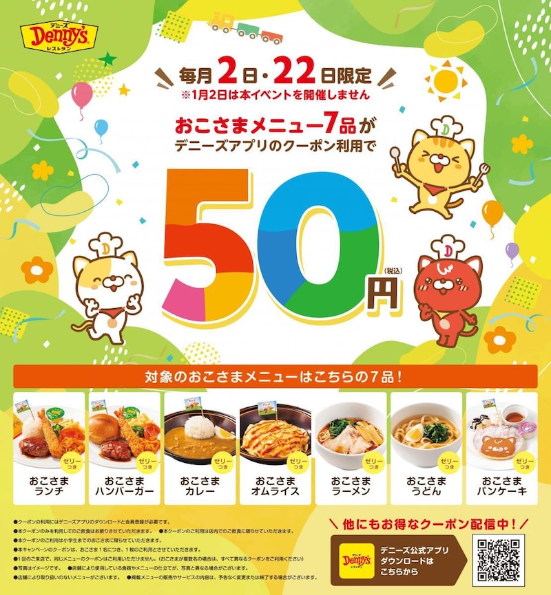 デニーズは、毎月2日と22日限定で対象のおこさまメニューが50円になるクーポンを公式アプリで配信中です。