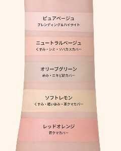 青クマを自然に隠すレッドオレンジ、くすみを飛ばすソフトレモン、赤みやニキビ跡を補正するオリーブグリーンなど、用途に合わせたカラーが絶妙に配置。